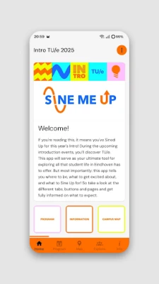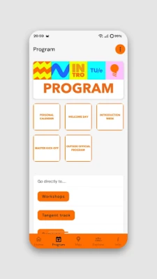 Welcome to the app of the introduction days of the University Eindhoven of Technology. This app is a guide during the Introduction Week, the Master Kick-Off and the Welcome Day Internationals. The personal program, general information, an overview of all associations and organizations can be found in the app and it also contains the necessary functions for these weeks such as registering for certain program parts and workshops. With the app it is possible to charge your wristband, which is linked to your personal account. With this wristband drinks can be paid at the bar.