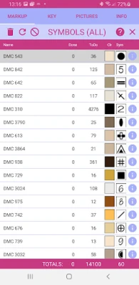 Markup R-XP recognises the symbols in your chart and can tell you how many are stitched and left to stitch. If you chart has a key, Markup R-XP can also automatically determine the thread colour for each symbol. If there is no key, no problem, you can also simply assign up to four thread colours to a symbol.